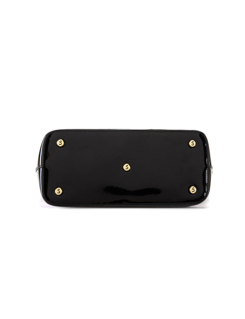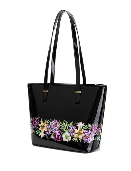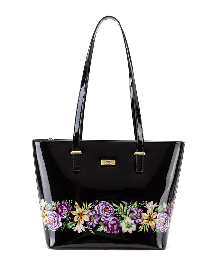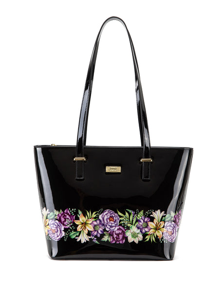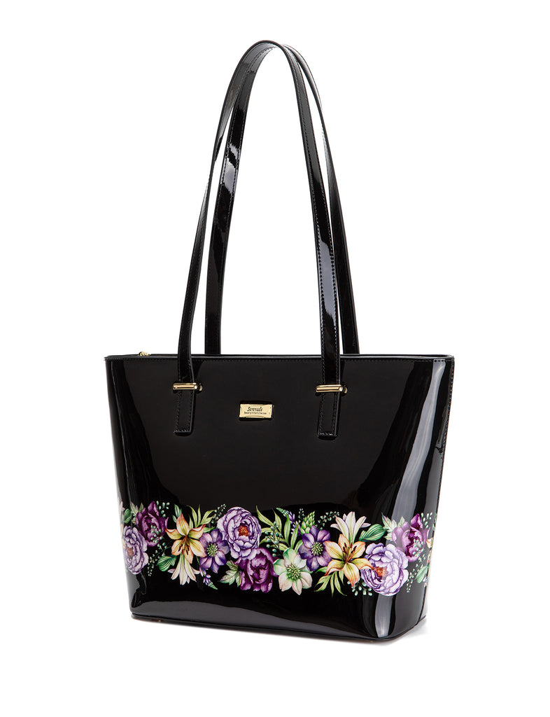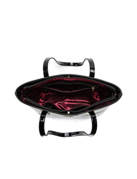 This Serenade Beverly Hills Collection, Ambretta leather tote bag is perfect for everyday. Crafted from premium leather with a patent finish. This bag opens easily and features a central zippered compartment as well as two magnetic snap closure compartments.