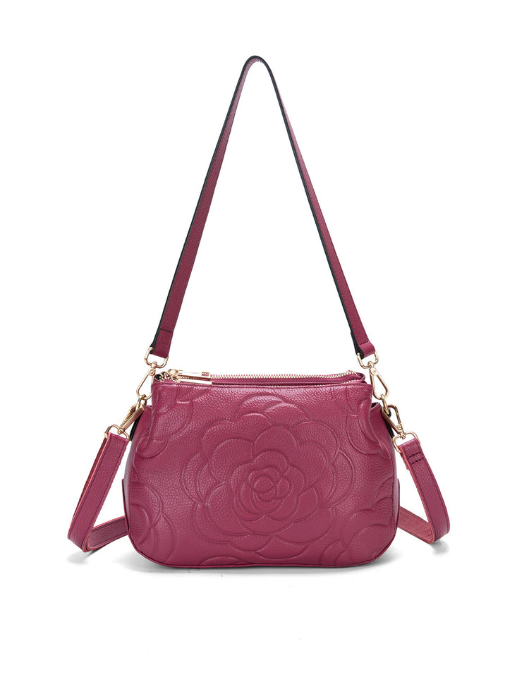 This Elegant Rosie Leather Cross Body Bag is crafted from genuine leather and has a beautiful floral debossed pattern on the main body of the bag. This bag has three zippered compartments, as well as one additional zippered compartment on the back of the bag. Rosie has one internal zippered pocket and one pouch ideal for your mobile phone. All of these features are ideal for organising your belongings. With high quality custom metal fitting detail in light gold, this bag is stylish and elegant.